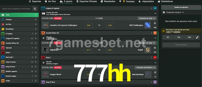 O 777hh oferece uma grande seleção de opções de apostas em e-sports com probabilidades competitivas